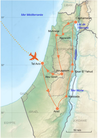 • La documentation de voyage : étiquettes bagages, atlas biblique Le Monde de la Bible ou missel Magnificat Terre Sainte, livret d’informations pratiques (numérique), un chèche et sur place une carte d’Israël détaillée.